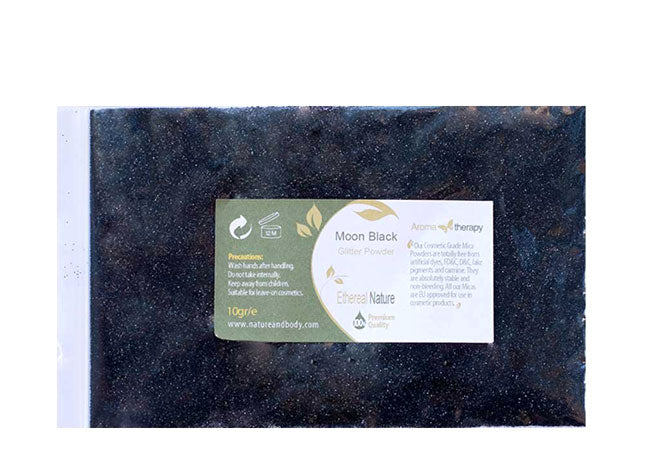 Το glitter powder Moon Black είναι ένα βαθύ, έντονο χρώμα με εφέ λάμψης μαύρου μαργαριταριού. Προσφέρει διαφάνεια και ανακλαστικότητα και χαρίζει ελαφριά προς μεσαία κάλυψη και υψηλή λάμψη. Είναι κατάλληλο για καλλυντικά προσώπου, ματιών, χειλιών και νυχιών. Χρησιμοποιείται στα σαπούνια για την επίτευξη αστραφτερών και λαμπερών αποχρώσεων, παρουσιάζοντας πολύ μεγάλη σταθερότητα. Το μέγεθος του κόκκου κυμαίνεται μεταξύ 10-60 microns. Τα χρώματα Mica είναι φυσικές χρωστικές οι οποίες προέρχονται από ορυκτά, τα οποία καθαρίζονται και στη συνέχεια θρυμματίζονται σε πολύ ψιλή σκόνη. Δεν είναι τοξικά και μπορούν να χρησιμοποιηθούν ακόμη και σε παιδιά για αποκριάτικες βαφές. Μπορούν να δώσουν χρώμα και λάμψη σε γαλακτώματα και πούδρες και μπορούν να ανακατευτούν μεταξύ τους προκειμένου να επιτευχθούν εντυπωσιακές αποχρώσεις.
