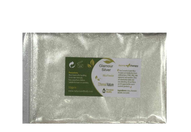 Το Silver Glamour είναι ένα έντονο, ζωηρό χρώμα με εντυπωσιακούς ιριδισμούς, σχεδόν διαφανές όταν απλώνεται στην επιδερμίδα και συνδυάζεται υπέροχα με όλα τα χρώματα δίνοντας εντυπωσιακή λάμψη στο μακιγιάζ. Χαρίζει ελαφριά κάλυψη και ιδιαίτερα υψηλή λάμψη και είναι κατάλληλο για καλλυντικά προσώπου, ματιών, χειλιών και νυχιών. Χρησιμοποιείται στα σαπούνια για την επίτευξη αστραφτερών και λαμπερών αποχρώσεων, παρουσιάζοντας πολύ μεγάλη σταθερότητα. Το μέγεθος του κόκκου κυμαίνεται μεταξύ 10-60 microns. Τα χρώματα Mica είναι φυσικές χρωστικές οι οποίες προέρχονται από ορυκτά, τα οποία καθαρίζονται και στη συνέχεια θρυμματίζονται σε πολύ ψιλή σκόνη. Δεν είναι τοξικά και μπορούν να χρησιμοποιηθούν ακόμη και σε παιδιά για αποκριάτικες βαφές. Μπορούν να δώσουν χρώμα και λάμψη σε γαλακτώματα και πούδρες και μπορούν να ανακατευτούν μεταξύ τους προκειμένου να επιτευχθούν εντυπωσιακές αποχρώσεις.