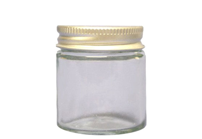 Γυάλινο διάφανο δοχείο χωρητικότητας 30ml, με γυαλιστερό καπάκι κατασκευασμένο από αλουμίνιο.